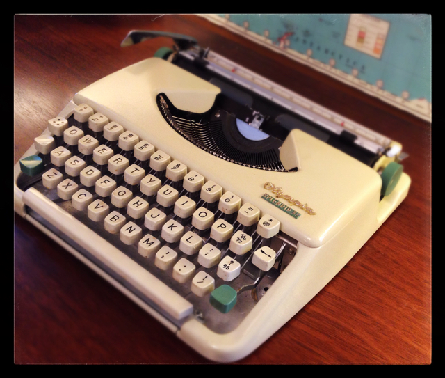 When the 1960s rolled around, Olympia had ascended to the top of the typewriter heap. While their good looks went with the disappearance of the SM3&4s, their solid mechanicals continued to shine. By the time the SM9 was introduced, Olympia had perfected the portable typewriter. It won’t win any design contests, but when you need a solid typewriter, the SM9 is any easy recommendation. The Splendid 33 stradles both these lineages. It has buttery soft lines on the outside and precise German mechanicals on the inside. This is a performer. While it looks small, it feels big. Olympia didn’t skimp on the Splendid. The key touch is light and snappy, yet doesn’t feel cheap. The bigger typewriters may have a more solid thud-thud sound to them, but when it comes to portability, the Splendid has a snap-on shell that makes it easy to stow or go. Even if you have a permanent home on your desk for the bigger machine, the Splendid makes a great second typewriter for hitting the road. While the Hermes Rocket has that cool, aqua color, the Splendid performs much better. The biggest advantage the Splendid has over the Rocket is the carriage return lever. This has always been my complaint with the Rocket, it has this stubby little thing that’s hard to catch with your fingers. Not so with the Splendid. It’s big and sticks out nicely. Plus, it has the same snap-on shell as the Rocket. Easy choice, I’d go with the Splendid. Olympia ditched the shell with the later model SF. For this size typewriter, I like the shell. It just makes a tighter, easier to handle package.